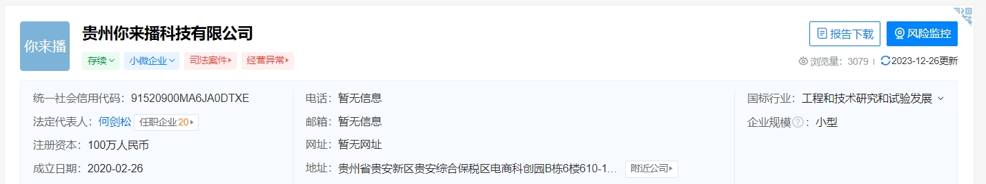 贵州你来播科技有限公司成立于2020年2月,目前公司显示经营异常。