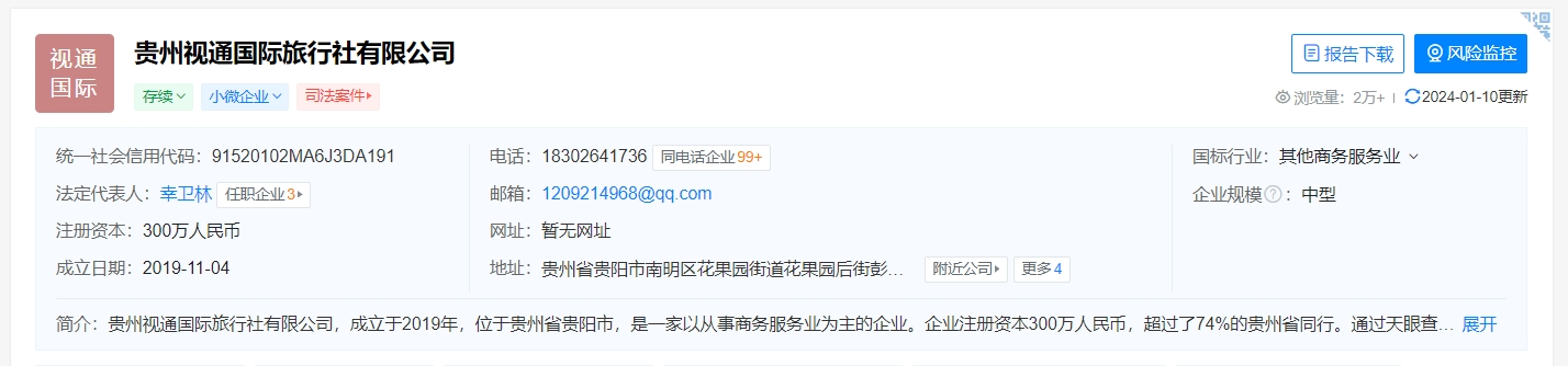 天眼查显示,贵州视通国际旅行社有限公司,成立于2019年,注册地址显示为:贵州省贵阳市南明区花果园街道花果园后街彭家湾棚户区改造项目B区第B南12(国际金融街6号)栋(12)1单元18层1号房A-76号工位[花果园办事处]。