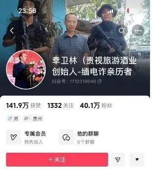 社交媒体上,幸卫林相关的抖音账号有三个,其中粉丝数为40万的“幸卫林”账号(认证信息为:贵视旅游酒业创始人-缅电诈亲历者),最近一次更新是在2023年12月10日,视频内容显示幸卫林在某个签约仪式上。截至今天,已有一个月没更新。