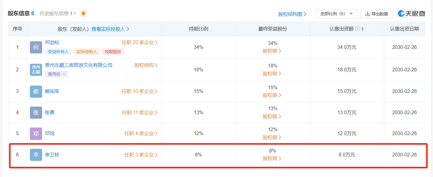 其中,在贵州视通国际旅行社有限公司,幸卫林担任法定代表人;在贵州你来播科技有限公司,幸卫林为股东,占股8%。